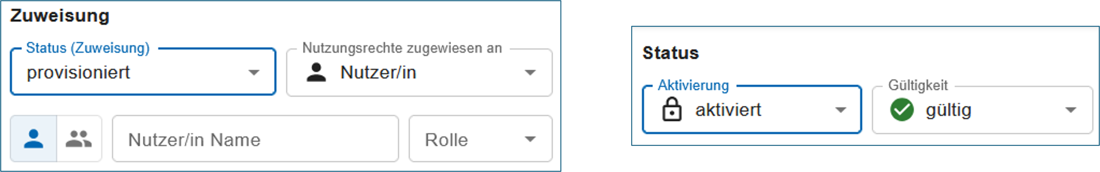 Nachdem der Status zugewiesen oder provisioniert ausgewählt wurde, öffnen sich weitere Filtermöglichkeiten. Sie können hier nun nach Nutzer/in, Lerngruppe oder Organisation filtern, um nur Lizenzen anzuzeigen, die der jeweiligen Auswahl zugewiesen sind. Wenn nach Nutzer/in weiter gefiltert wird, haben Sie die Möglichkeit den Vor- oder Nachnamen oder die Rolle des Nutzenden als weiteres Filterkriterium anzugeben.