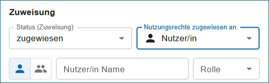 Nachdem der Status zugewiesen oder provisioniert ausgewählt wurde, öffnen sich weitere Filtermöglichkeiten. Sie können hier nun nach Nutzer/in, Lerngruppe oder Organisation filtern, um nur Lizenzen anzuzeigen, die der jeweiligen Auswahl zugewiesen sind. Wenn nach Nutzer/in weiter gefiltert wird, haben Sie die Möglichkeit den Vor- oder Nachnamen oder die Rolle des Nutzenden als weiteres Filterkriterium anzugeben.