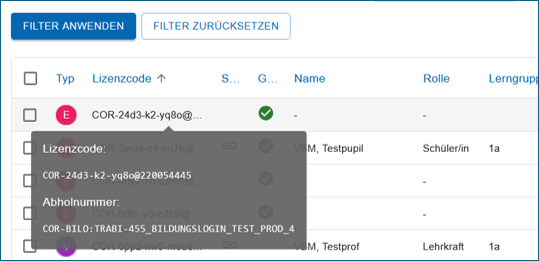 Wenn Sie mit der Maus über den Lizenzcode fahren, erscheint eine Box, in der die Abholnummer zur Lizenz angezeigt wird.